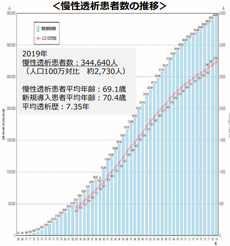 厚生労働省の資料によると、2019年の時点において人工透析を受ける慢性透析患者数は約34万人となっており、年々患者数は増加傾向にあります。