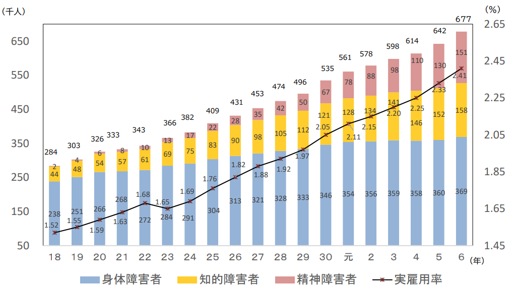 2024年6月1日時点で民間企業に雇用されている障がい者の数は約67.7万人となっており、21年連続で過去最高を更新しています。実雇用率は2.41%となり、法定雇用率の2.5%に届かないものの長期的に上昇している状況です。