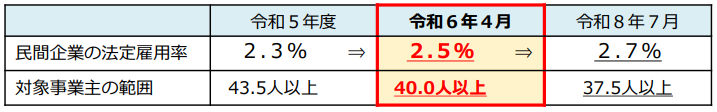 適用開始時期と法定雇用率の引き上げ率は、以下のとおりです。