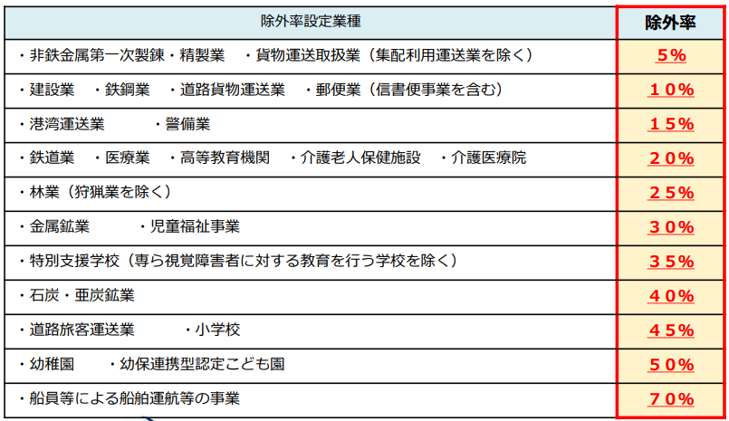 除外率が設定される業種と2025年4月1日改訂の除外率は、以下のとおりです。